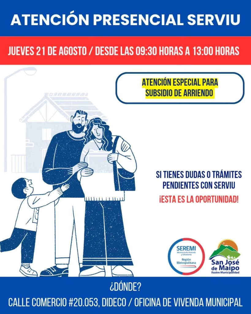 La Oficina de Vivienda de San José de Maipo, invita a resolver dudas sobre subsidios habitacionales en la atención presencial de Serviu este jueves 21 de agosto, entre las 09:00 y 13:00 horas, en las dependencias de la Oficina de Vivienda, en DIDECO de la Ilustre Municipalidad de San José de Maipo.
