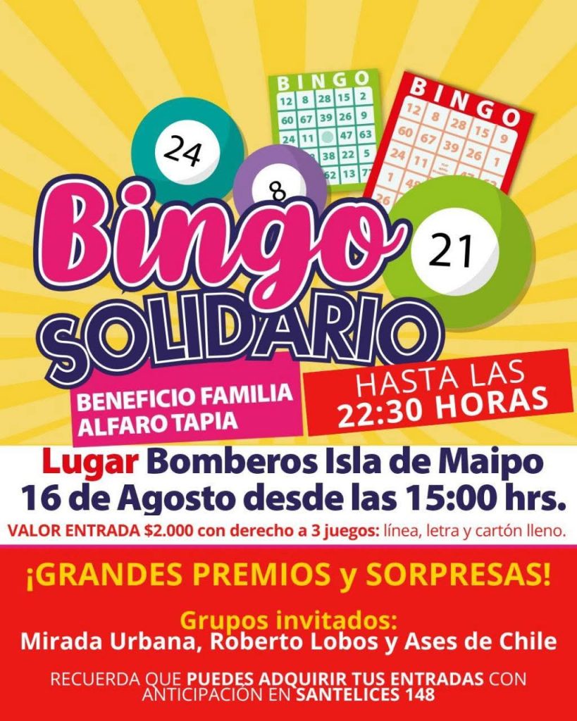 El próximo 16 de agosto, desde las 15:00 hasta las 22:30 hrs, se realizará un Bingo Solidario en el recinto de Bomberos Isla de Maipo. El evento busca recaudar fondos para apoyar a la familia Alfaro Tapia. Con una entrada de $2.000, los asistentes podrán participar en tres juegos: línea, letra y cartón lleno. Habrá grandes premios, sorpresas y música en vivo con los grupos Mirada Urbana, Roberto Lobos y Ases de Chile. Las entradas están disponibles en Santelices 148.