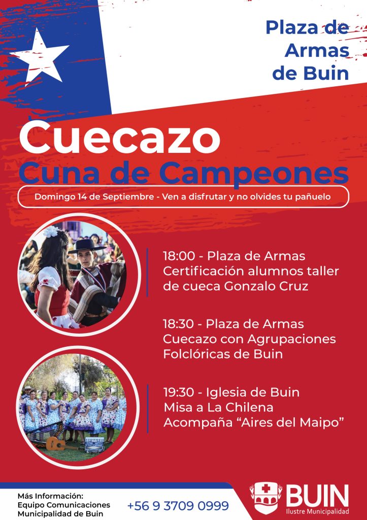 Este domingo 14 de septiembre, la Plaza de Armas de Buin se viste de fiesta con el “Cuecazo Cuna de Campeones”, una jornada dedicada a la cueca y las tradiciones chilenas. Desde las 18:00 horas, se realizará la certificación de alumnos del taller de cueca Gonzalo Cruz, seguida por una presentación masiva de agrupaciones folclóricas locales.