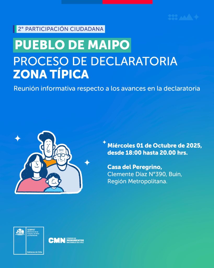 El próximo miércoles 1 de octubre, entre las 18:00 y las 20:00 horas, se realizará una reunión informativa sobre los avances en el proceso de declaratoria de Zona Típica para el Pueblo de Maipo.