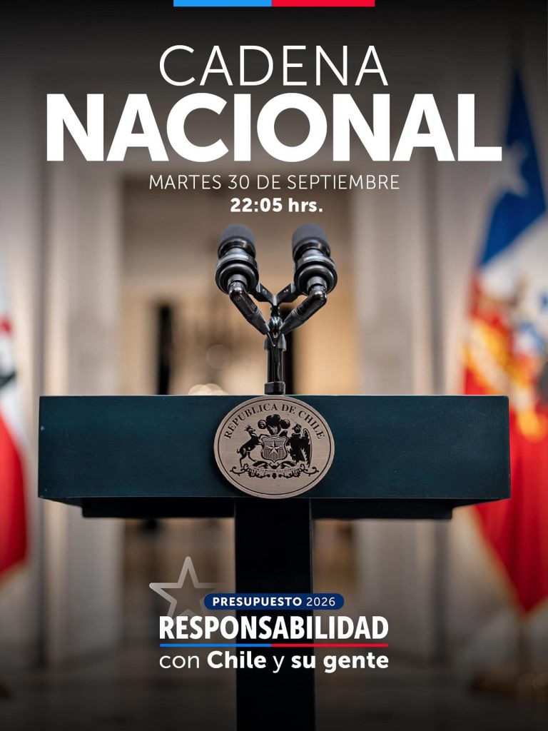 Hoy martes 30 de septiembre a las 22:05 horas, el Presidente de la República, Gabriel Boric Font, se dirigirá a todos los chilenos y chilenas en Cadena Nacional desde el Palacio de La Moneda, para presentar el Proyecto de Ley #Presupuesto2026.