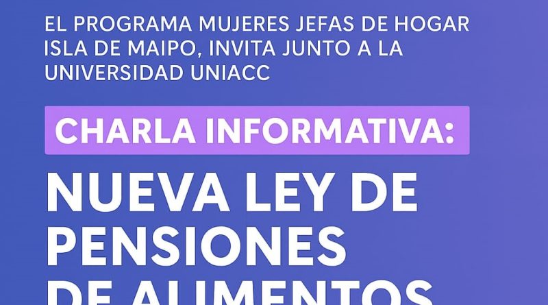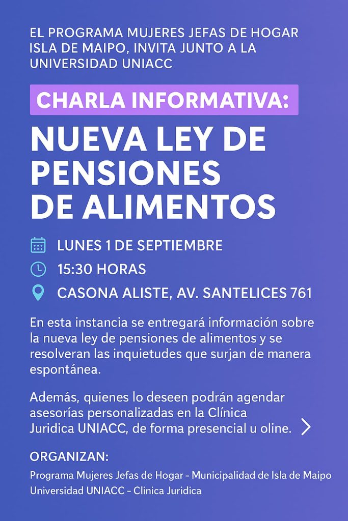 El próximo lunes 1 de septiembre a las 15:30 horas se realizará una charla informativa sobre la nueva Ley de Pensiones de Alimentos en la Casona Aliste, ubicada en Av. Santelices 761, Isla de Maipo. La actividad busca orientar a la comunidad sobre los alcances de esta normativa y resolver dudas de manera directa. Además, se ofrecerá asesoría jurídica gratuita a través de la Clínica Jurídica de la Universidad UNIACC, tanto presencial como online. El evento es organizado por el Programa Mujeres Jefas de Hogar de Isla de Maipo, la Municipalidad local y la UNIACC.