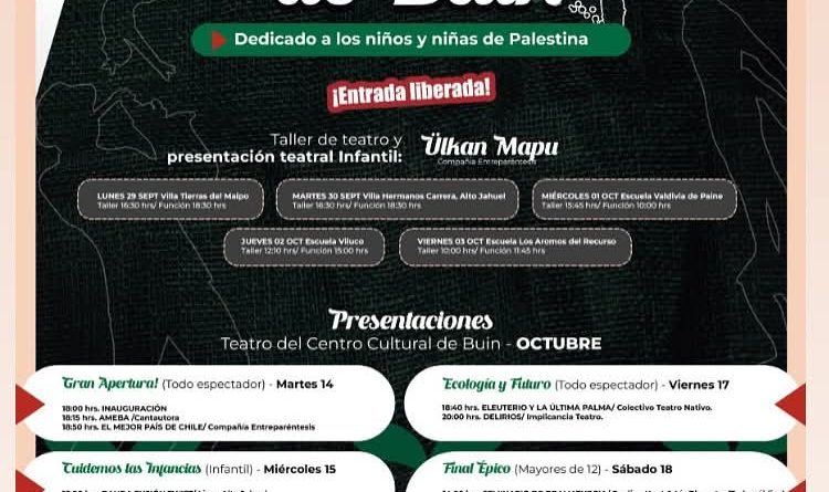 La comuna de Buin recibe una nueva edición del esperado Festival de Teatro de Buin, que este año celebra su 17ª versión con una programación gratuita y abierta a toda la comunidad. Organizado por la compañía Teatro Entreparentesis, el evento se desarrollará entre el 14 de octubre y el 18 de octubre, con actividades en el Centro Cultural de Buin.