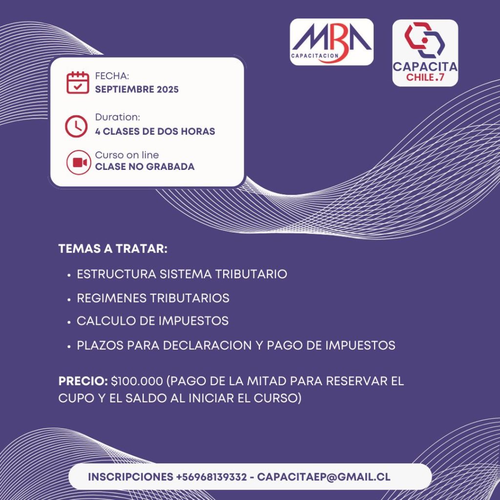 En septiembre de 2025 se llevará a cabo un curso online sobre impuestos, organizado por MBA Capacitación y Capacitachile.7, dirigido a personas y profesionales que deseen comprender y aplicar correctamente la normativa tributaria vigente.