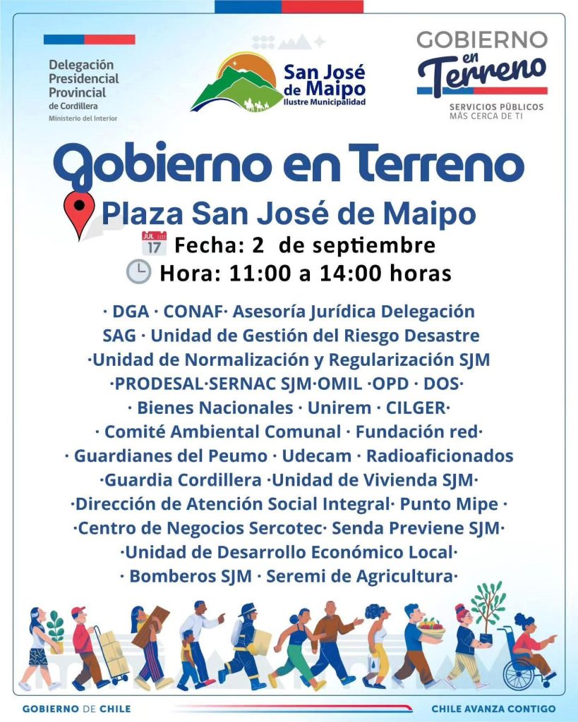 Este martes 2 de septiembre, entre las 11:00 y las 14:00 horas, te esperamos en la Plaza de San José de Maipo para acercar los servicios públicos a la comunidad. 🤝🏞️