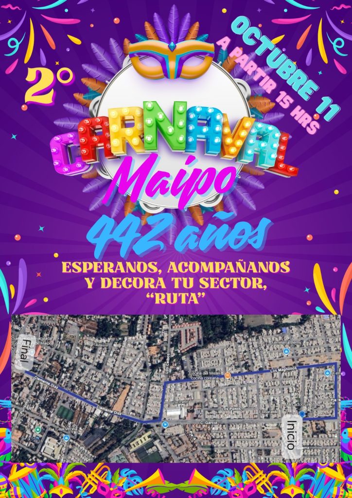 Este sábado 11 de octubre, a partir de las 15:00 hrs, las calles de Maipo se llenarán de música, alegría y tradición con el 2° Carnaval en honor a los 442 años de la comuna.
