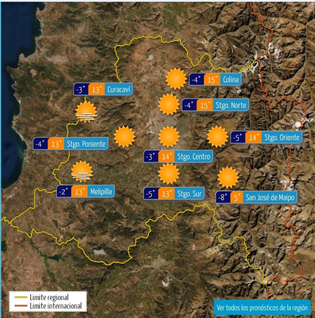 Pese al intenso frío matinal, el cielo se mantiene mayormente despejado en todas las comunas, lo que anticipa una tarde soleada. Las autoridades recomiendan tomar precauciones ante las heladas, especialmente en zonas cordilleranas.