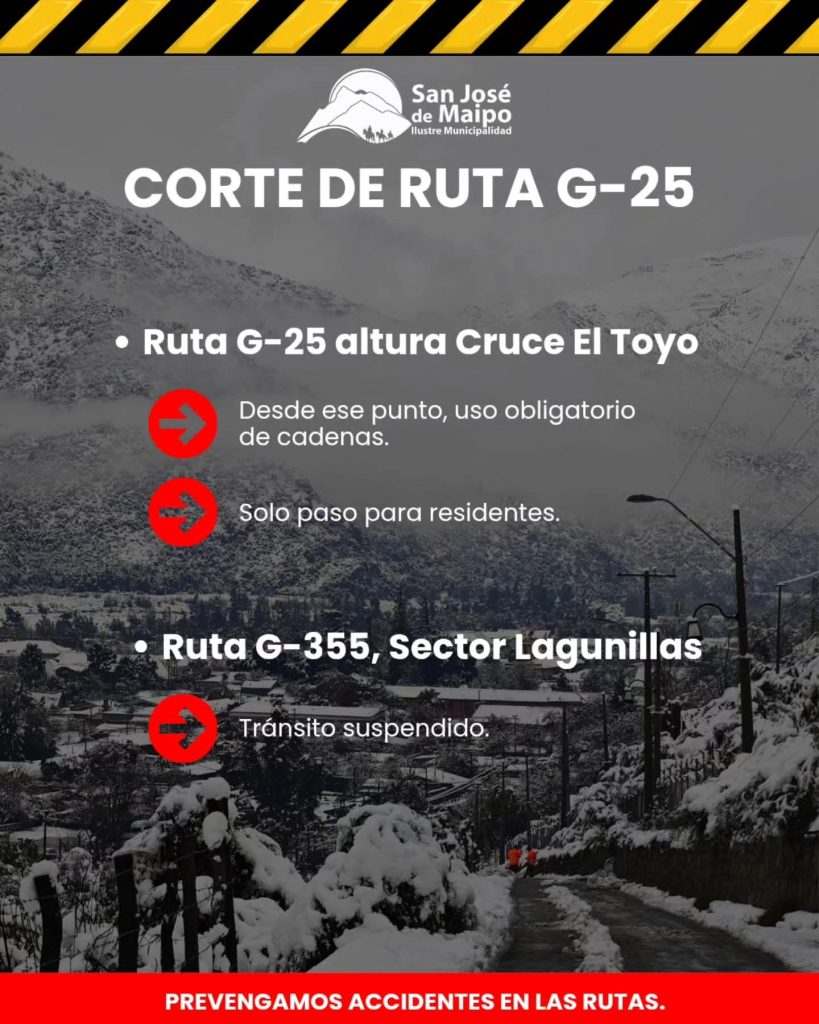 San José de Maipo: Informan suspensión de tránsito en rutas